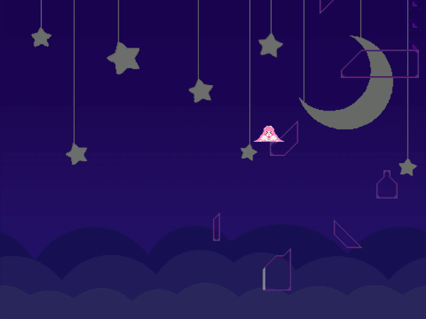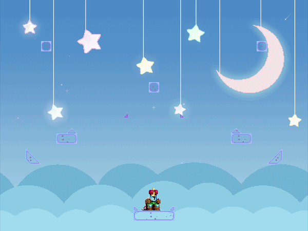 6画面目。タワーの中で一番気に入ってる画面。ここまでくると背景がかなり暗くなり、星のギラギラ感が良い感じです。ここで使っているmini slopeのおもしろ挙動はglitch babe+で知ったやつです。一度左から右に回って真ん中を通って上に行くっていうルートにしたかったんですが、一方通行を使わないっていう隠しテーマがあったのでどうすればできるかなーって考えていたところで、このmini slopeの挙動を思い出しました。配置してみたところけっこういい感じに真ん中を通るルートが作れたので採用。