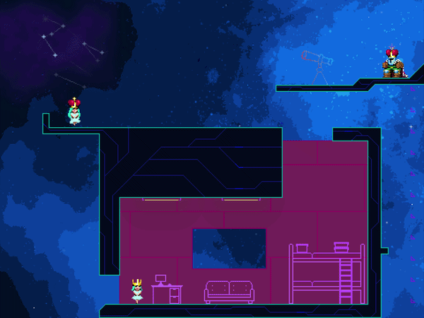 マップのデザインについては色々考えていましたが、1エリア目は空中都市の公園風のエリア、2エリア目は空中都市のマンション風のエリアにするというイメージが湧きました。姫画面をマンションの最上階にして、姉妹の部屋にするみたいなイメージですね。また、姫画面からスタートにするというアイデアも思いつきました。これは姉妹で2キャラ出したかったので、スタート地点で妹と話すために必要だったというのもあります。