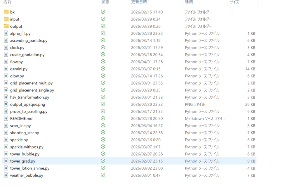 ただ、ここで紹介したアニメーションの作成方法については向き不向きがありますね。プログラムで生成しやすいのはシンプルだけど枚数が多いものなどで、イラストベースのアニメーションとか複雑なeffectを作るのには向いていないと思います。そういうのは手書きしました。
