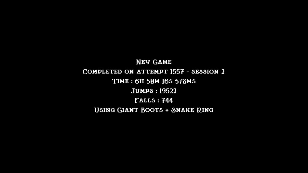 意外と時間はかかった。boots + ring自体が初めてだったけど、挙動に慣れてしまうとこれはこれでかなり楽しかった。1面のboots + ringは雪山だけが別格って感じですね。チャペルまで6h 41m、チャペルから9分でした。やはりチャペルは消すべき……。
