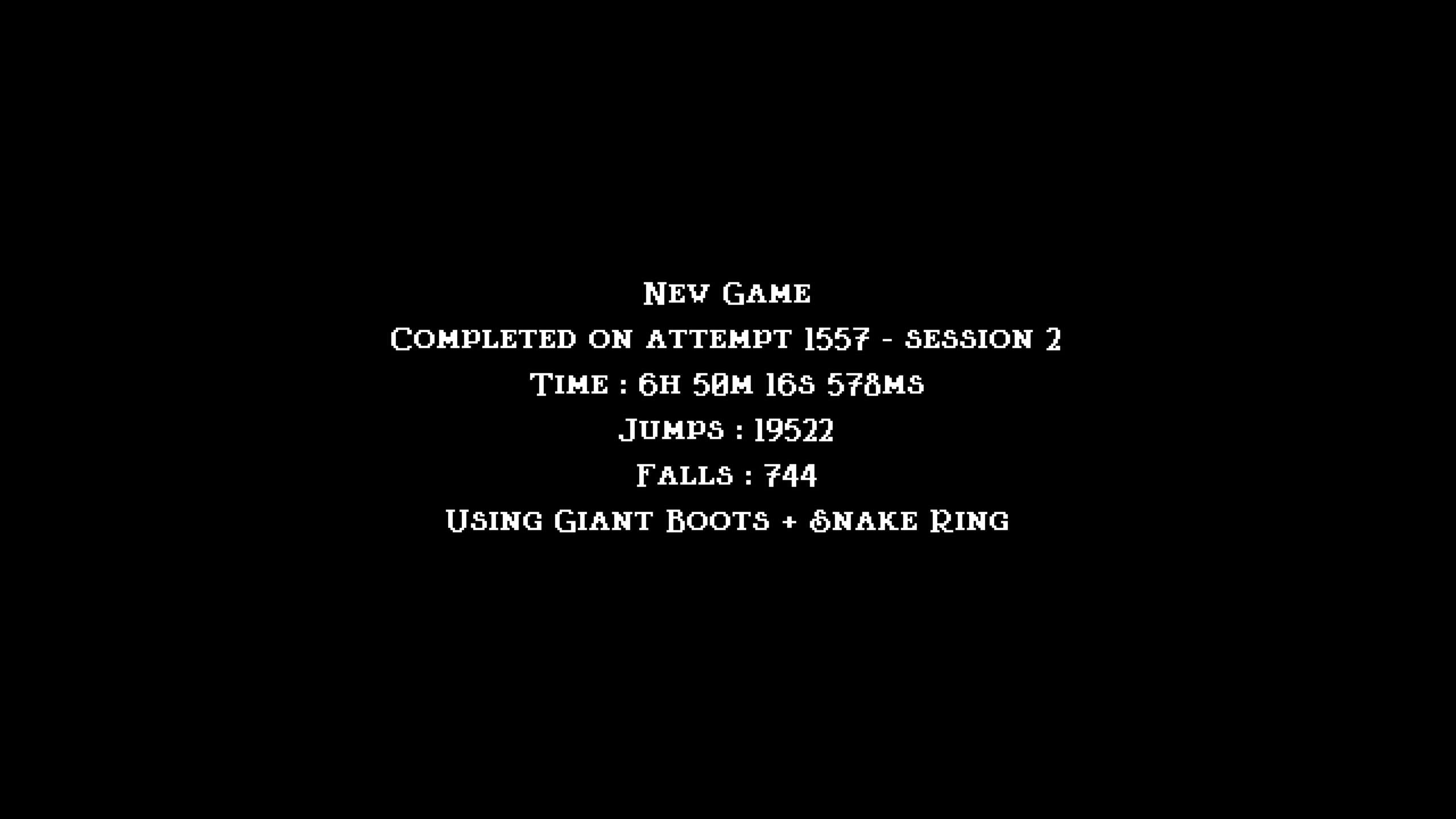意外と時間はかかった。boots + ring自体が初めてだったけど、挙動に慣れてしまうとこれはこれでかなり楽しかった。1面のboots + ringは雪山だけが別格って感じですね。チャペルまで6h 41m、チャペルから9分でした。やはりチャペルは消すべき……。
