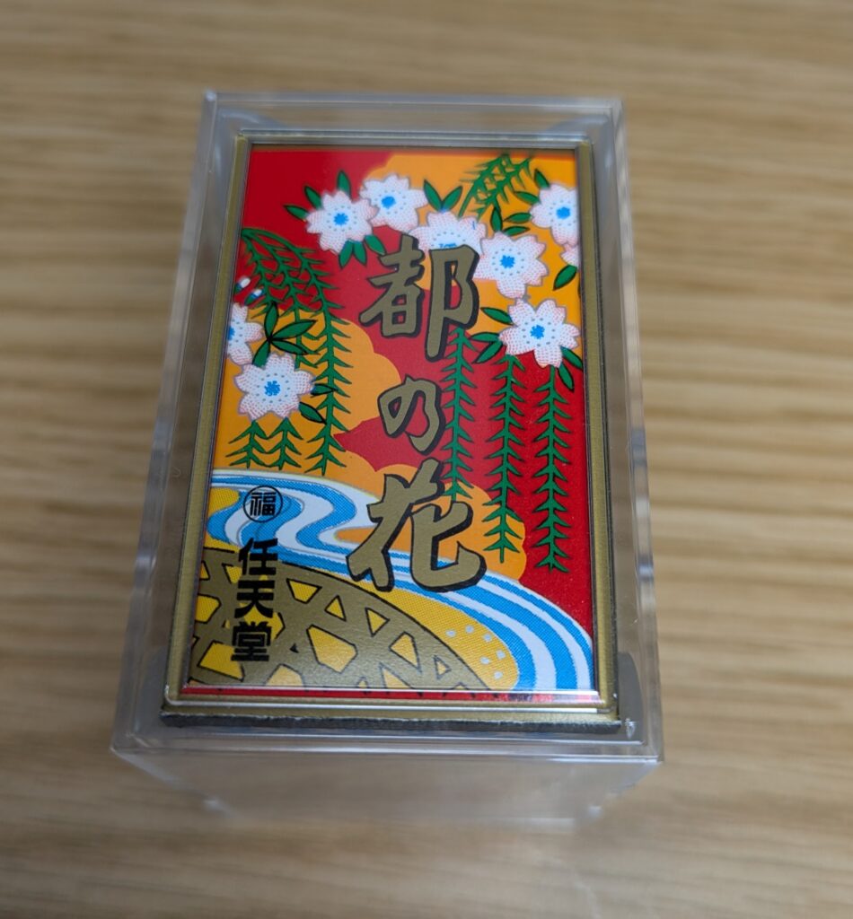 任天堂のスタンダードな花札で現行のものは「大統領」「丸福天狗」「都の花」の三種類があります。グレードは大統領>丸福天狗>都の花の順番です。当然全て機械貼りです。使用している紙の種類が違うようで、その差がグレードの差になっています。また大統領、丸福天狗はワンプッシュのケースに入っています。個人的にワンプッシュのケースがあまり好きではなかったので、都の花を買ってみました。