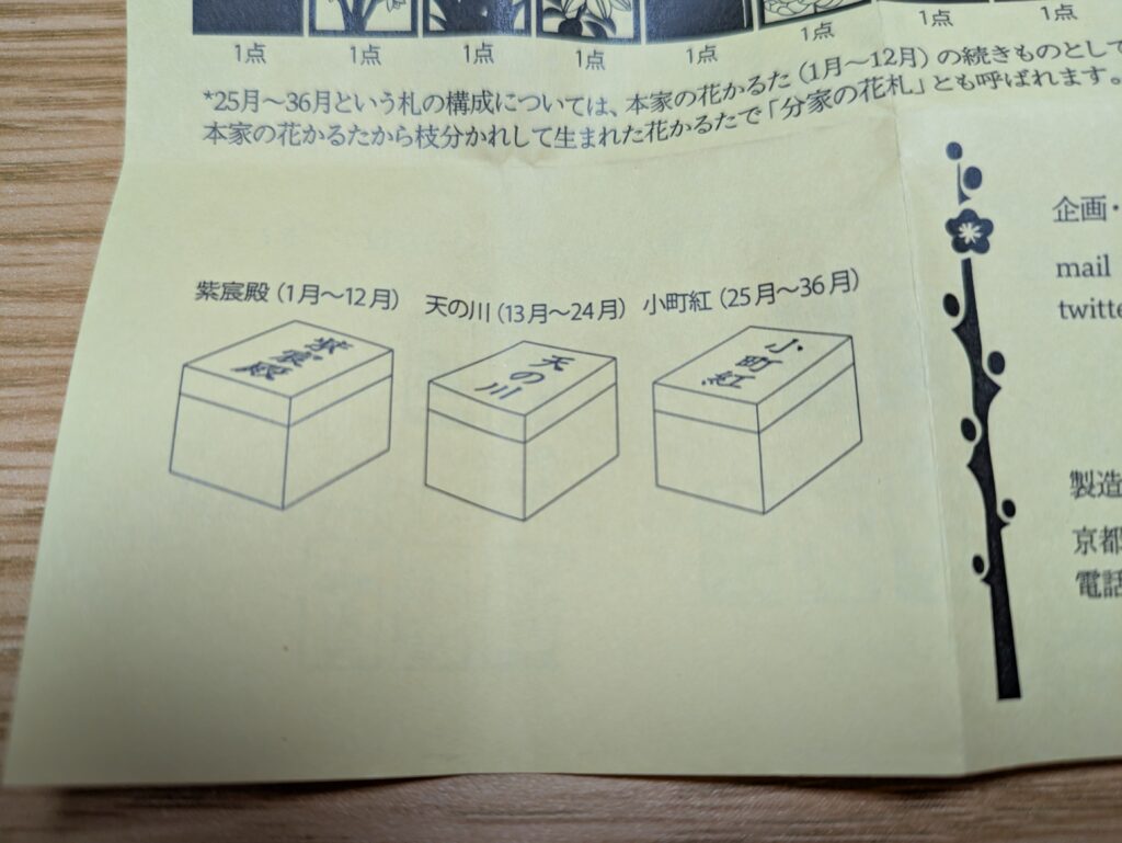 キタミ堂のデザインで、田村将軍堂が製造しているらしいです。桐箱は紫宸殿のものと同じものでした。本家の花札にない植物や動物が使われていて面白い感じですね。