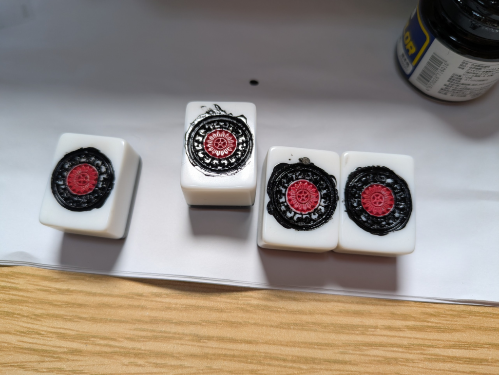 筒子のクオリティとしては、正直高いとは言えないです。なんというか全体的に黒っぽいんですよね。白が出るべきで、塗料が乗るべきじゃないところにも塗料が乗ってしまってる感じですかね。微妙ですね。あと、明らかに黒が滲んでいる牌とかもありました。上から2番目の6pとか。