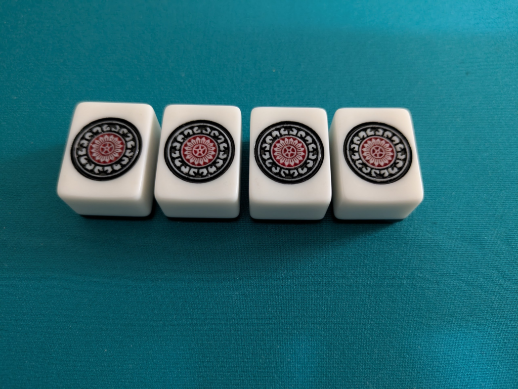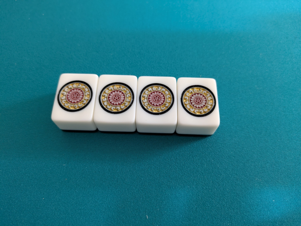 赤ドラと金ドラがそれぞれの色で2枚ずつ、後は花牌と変な十字の牌がついています。ふつうは赤4と花牌だけなのでこれはお得ですね。全赤にもできます。あとは花牌の文字が金色に塗られているのも個人的高評価ポイントですね。